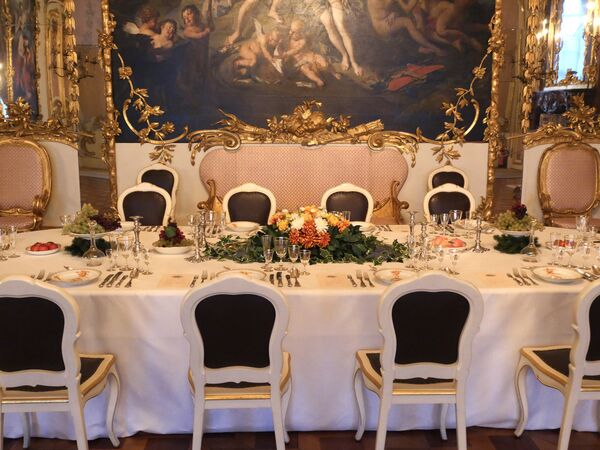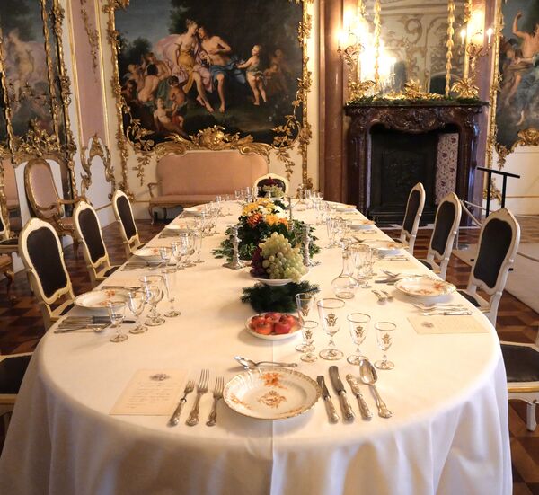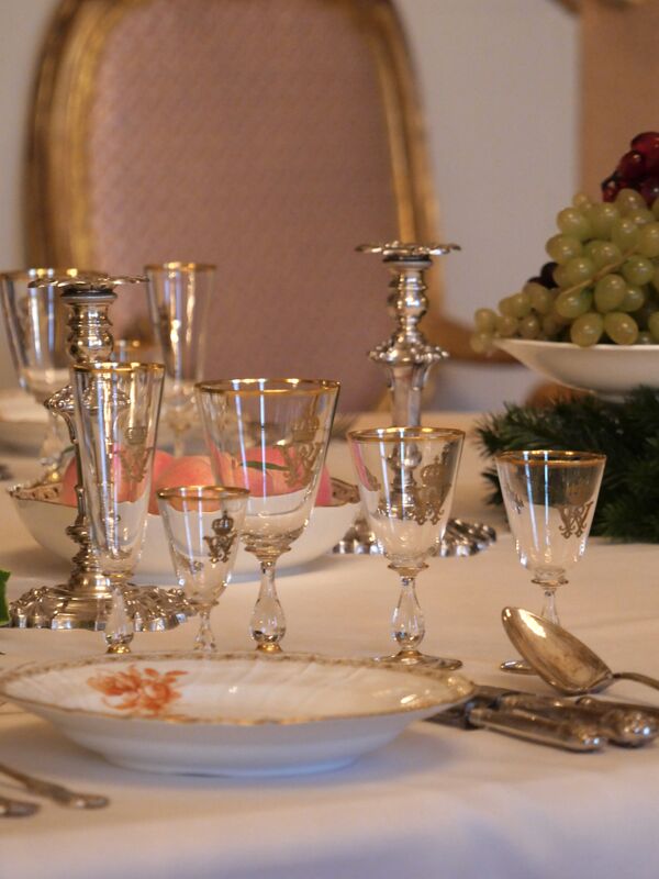 Im Unteren Konzertzimmer des Neuen Palais – einst als Speisezimmer der kaiserlichen Familie genutzt – erwartet Besucher:innen ab sofort noch bis Anfang 2026 eine festlich gedeckte Tafel. Gerade zur Weihnachtszeit, wenn in diesem Raum traditionell die kaiserliche Familie zusammenkam, vermittelt sie eindrucksvoll die besondere Atmosphäre vergangener Feiertage und die Tafelkultur am Hof.