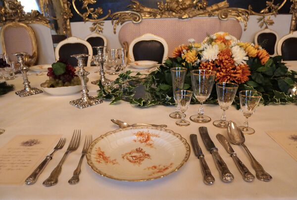 Die Tafel ist nach historischen Vorbildern arrangiert und mit dem kaiserlichen Service „Neuosier“ der Königlichen Porzellan-Manufaktur eingedeckt. Auch Gläser und Besteck stammen aus dem Besitz Kaiser Wilhelms II. Eine originale Menükarte datiert das festliche Mahl auf den 24. Dezember 1900 – ein Weihnachtsdinner der besonderen Art. Darauf finden sich Köstlichkeiten wie „Karpfen blau“, zarter Kalbsrücken, Gans, süße Mince Pies mit Rosinen-Apfel-Füllung sowie Früchte, Käsestangen und verschiedene Desserts.