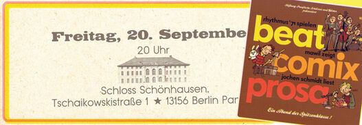 Der Comiczeichner Markus „Mawil“ Witzel, der Autor und Übersetzer Jochen Schmidt und die Band „Rhythmus 71“ mit ihrem Wohnzimmer-Beat laden zu einem Abend voller Bilder, Texte und Musik ein. Mawil liest aus seinen Comics, z.B. „Kinderland“ und der neuen Hommage an „Lucky Luke“, tatkräftig unterstützt von Jochen Schmidt. Dieser wird ebenfalls aus älteren und neueren Büchern lesen.