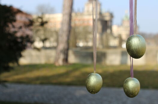 Wie immer bei der Sonntagswerkstatt steht auch diesmal zuerst ein Besuch mit Kurzführung im Neuen Palais auf dem Programm: Hier betrachten wir gemeinsam die kostbar glänzenden Ornamente. In der Museumswerkstatt können die Teilnehmer anschließend kleine Ostereier mit echtem Blattgold verzieren – damit es auch an ihrem Osterstrauß glänzt und funkelt wie im königlichen Schloss!