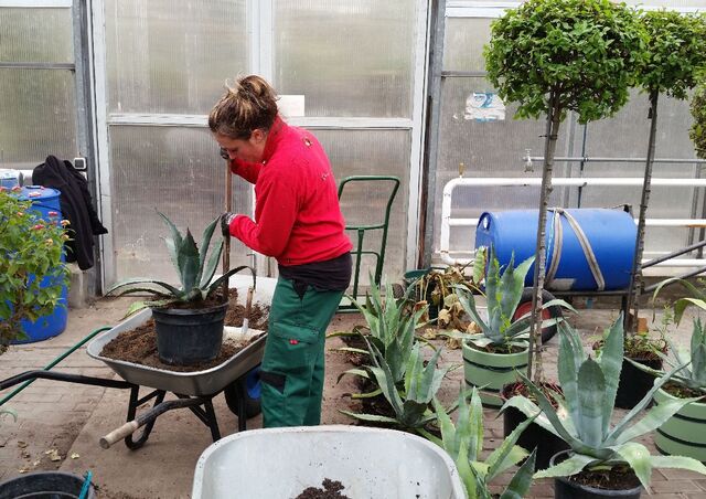 Die Agaven stehen normalerweise bei den Römischen Bädern im Park Sanssouci. Den Winter verbringen sie jedoch in der Parkgärtnerei. Über die Jahre sind die stachligen Pflanzen stark gewachsen, sodass ihre Töpfe ihnen nun zu klein geworden sind. Deshalb werden die Agaven momentan umgetopft. Der Stopfer ist hierbei ein nützliches Hilfsmittel, um die Erde im Topf besser zu verteilen und zu festigen.