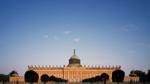 At the western end of the main avenue of Sanssouci Park stands an imposing palace building, recognizable from afar by its high tambour dome: the New Palace.