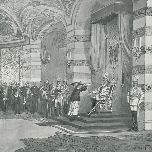 On September 4, 1901, the Grotto Hall at the New Palace provided the setting for a special purpose. Prince Chun, a brother of the Chinese emperor, was compelled to bow low and subserviently before the German emperor, William II. Dressed in the uniform of his elite personal bodyguard regiment, the Garde du Corps, and wearing its military helmet crowned by an eagle, William II sat upon his throne with a glowering expression on his face. The prince read a statement “in a low, but distinct voice” and presented to the German kaiser a handwritten letter from the emperor of China, bound in yellow silk. Unmoved, William’s “loud” response followed “with a heavy emphasis on his prominent points.” Afterward, Prince Chun had to leave the hall walking backward while humbly bowing four times. William II consciously staged this humiliation, intended as a demonstration of his imperial might.
