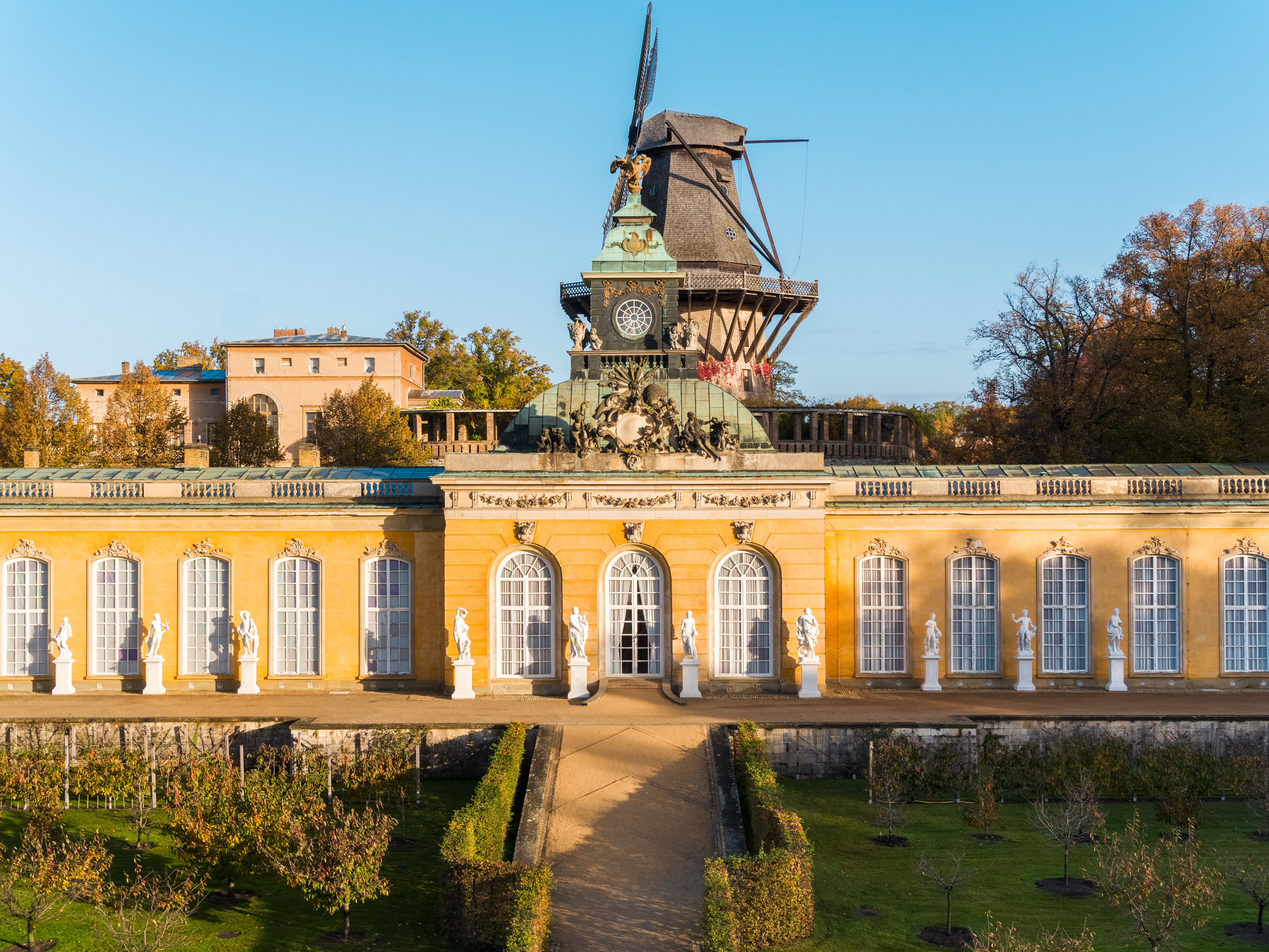 Although the King had adequate space to accommodate his guests in the New Palace, in 1771–1775 he had the orangery that formerly stood to the west of Schloss Sanssouci converted into a palatial guest-house.