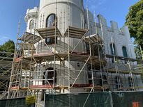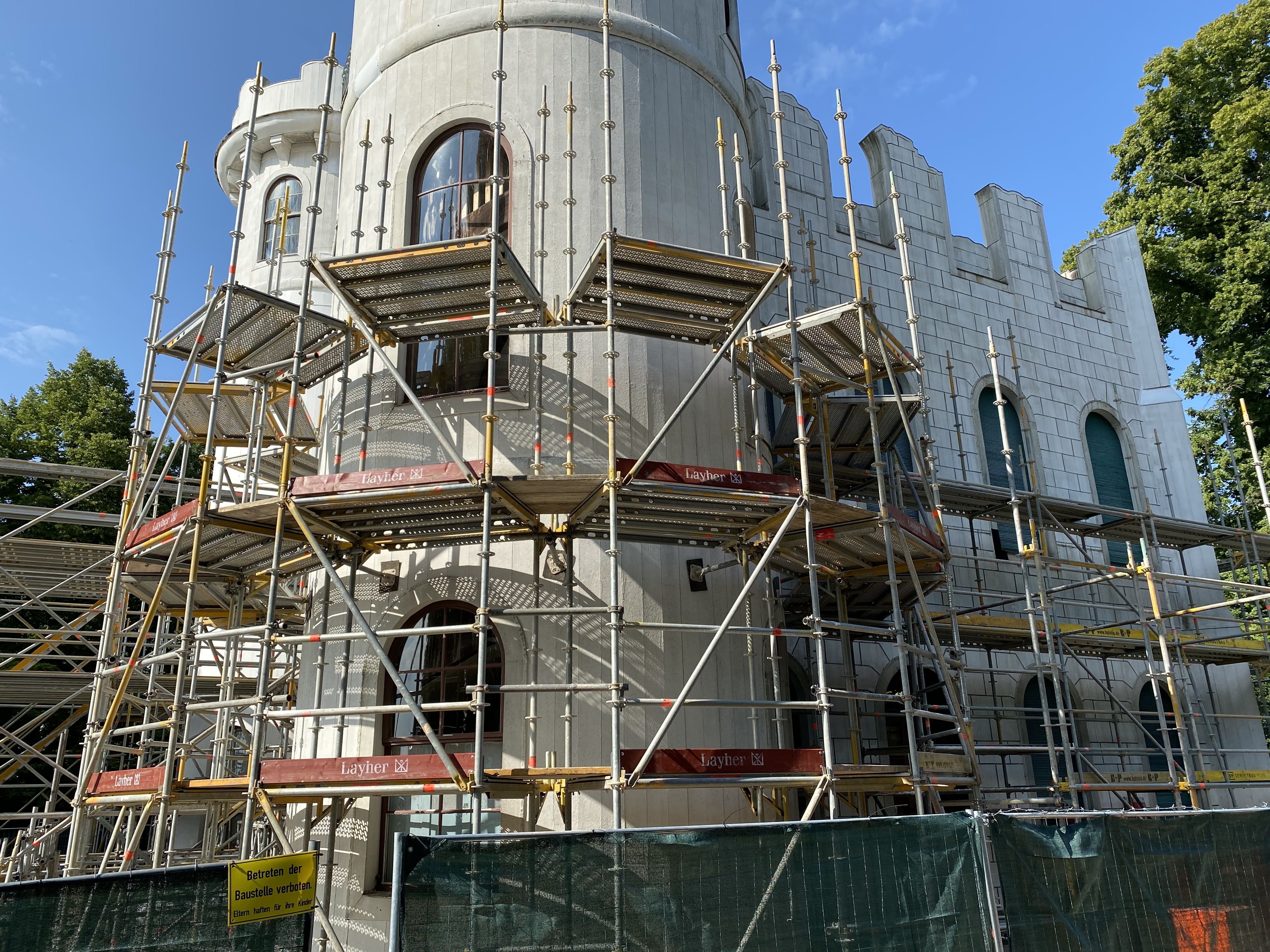 - Die Lage der Baustelle auf einer Insel und die sehr eingeschränkten Platzverhältnisse innerhalb der denkmal- und naturgeschützten Parkanlage erfordern eine sehr sorgfältige Planung der Baulogistik. Erschwerend kommt der besondere Platzbedarf des Gerüsts hinzu, welches aus statischen Gründen nicht am Gebäude verankert werden kann. Stattdessen werden mit Wasser gefüllten Ballasttanks notwendig, die sehr viel Fläche am Boden einnehmen.