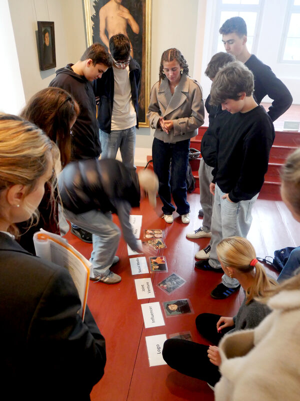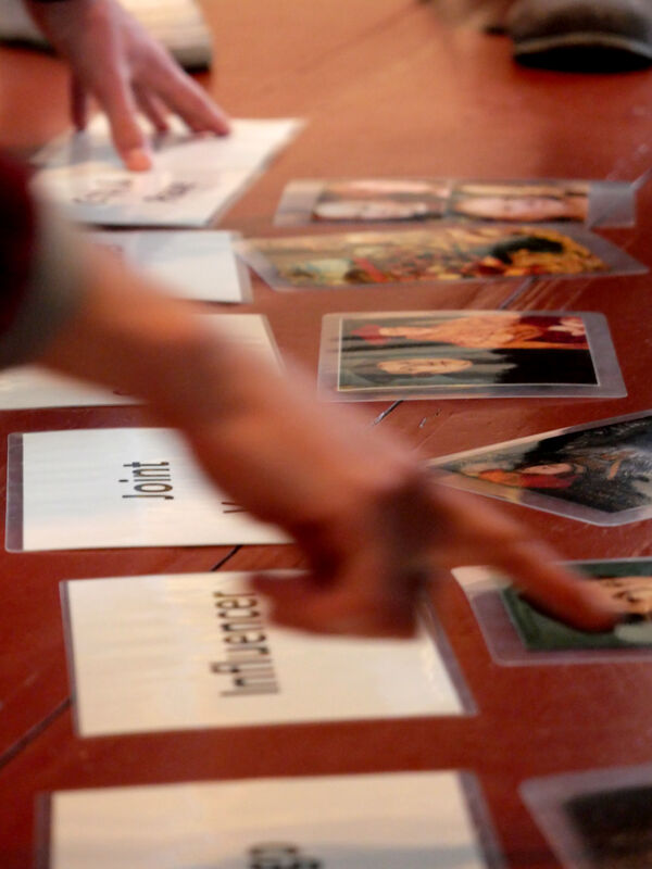 Ein Kartenspiel mit heutigen Begriffen – wie Social Media oder Influencer – wird mit Bildausschnitten aus den ausgestellten Werken kombiniert. Die offenen Zuordnungen dienen als Ausgangspunkt für Gespräche über Bildwirkung, Zielgruppen und Absichten.