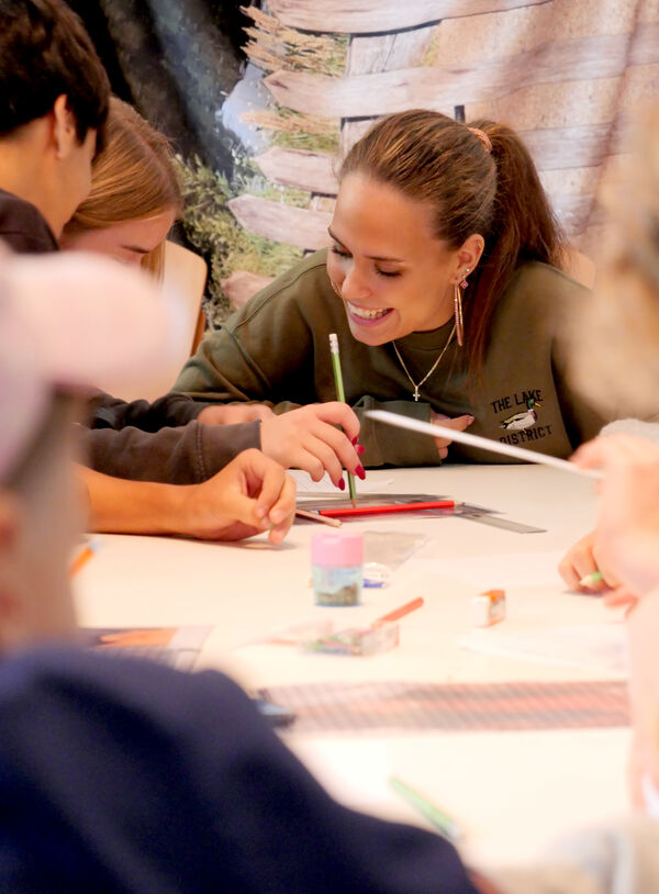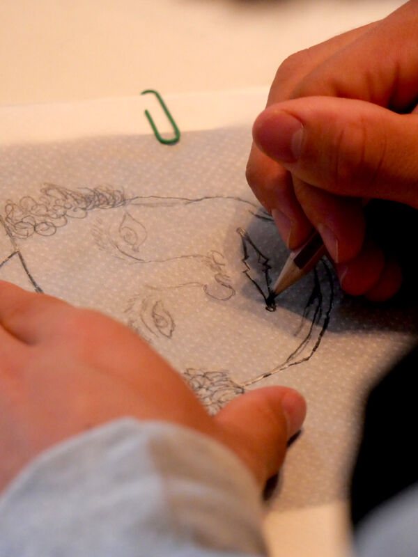 Während die eine Gruppe ein Logo entwickelt und dieses mit Hilfe einer einfachen Drucktechnik zu Papier bringt, beschäftigt sich die andere Gruppe mit Zeichnen und einer Vervielfältigungs- bzw. Kopiertechnik.